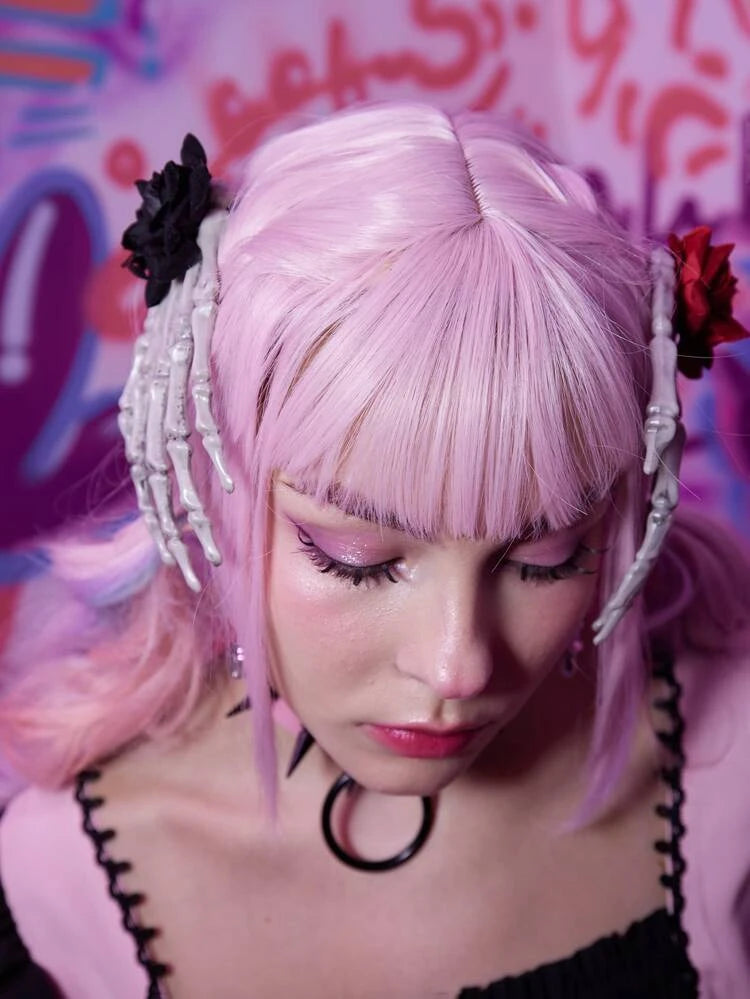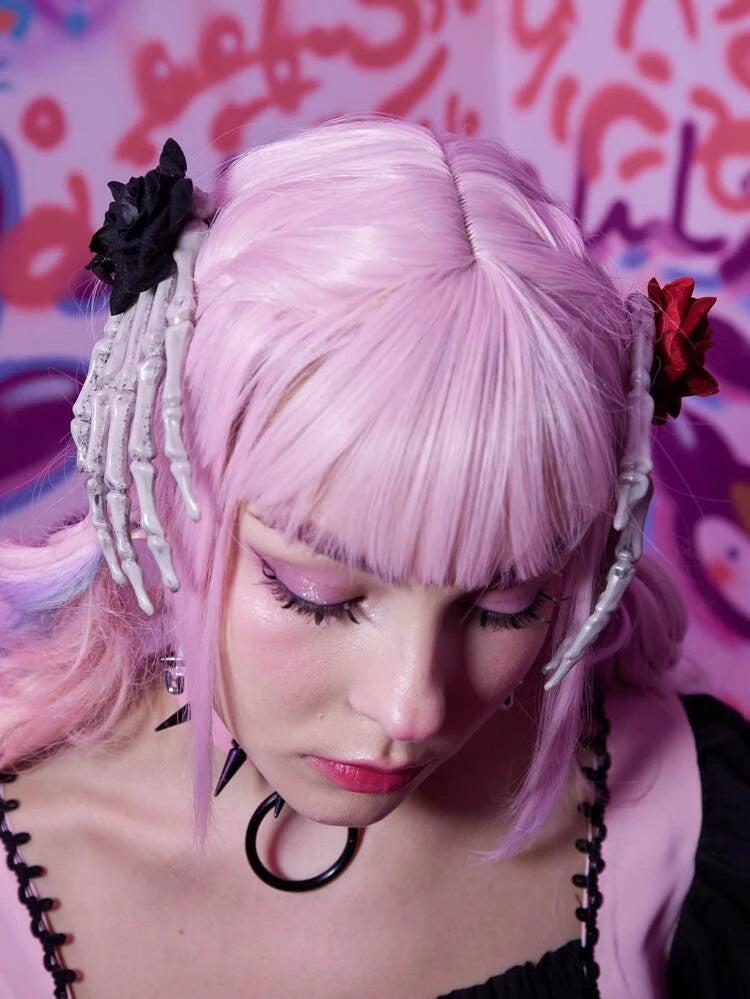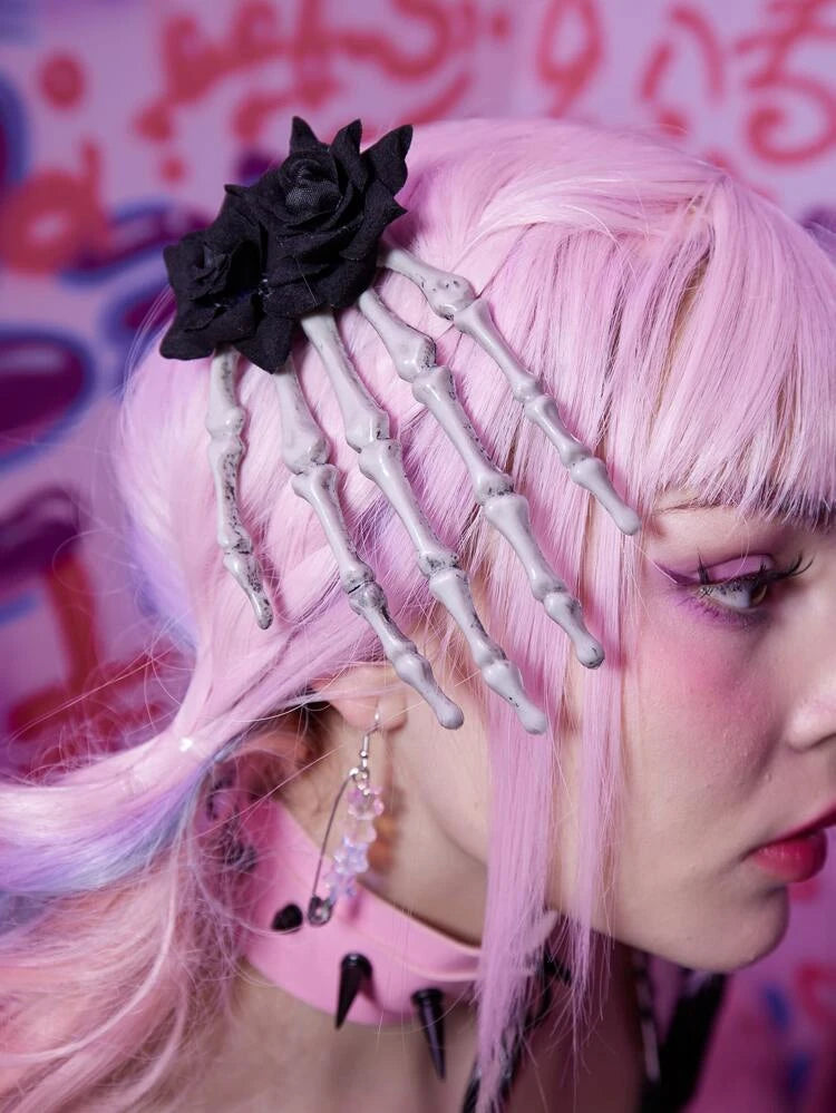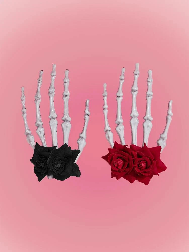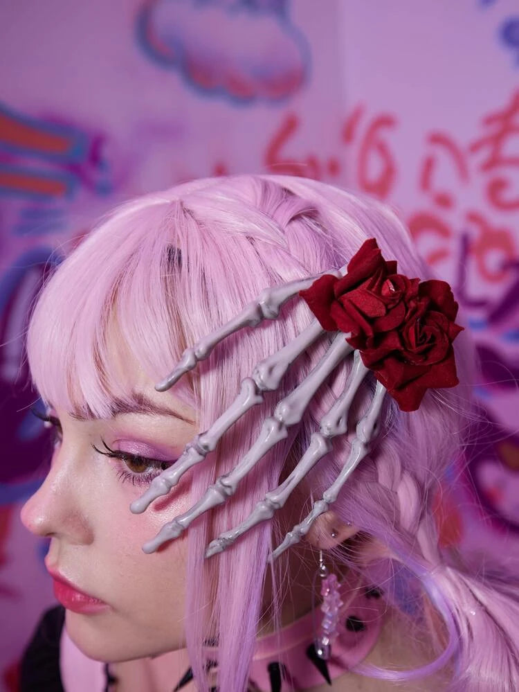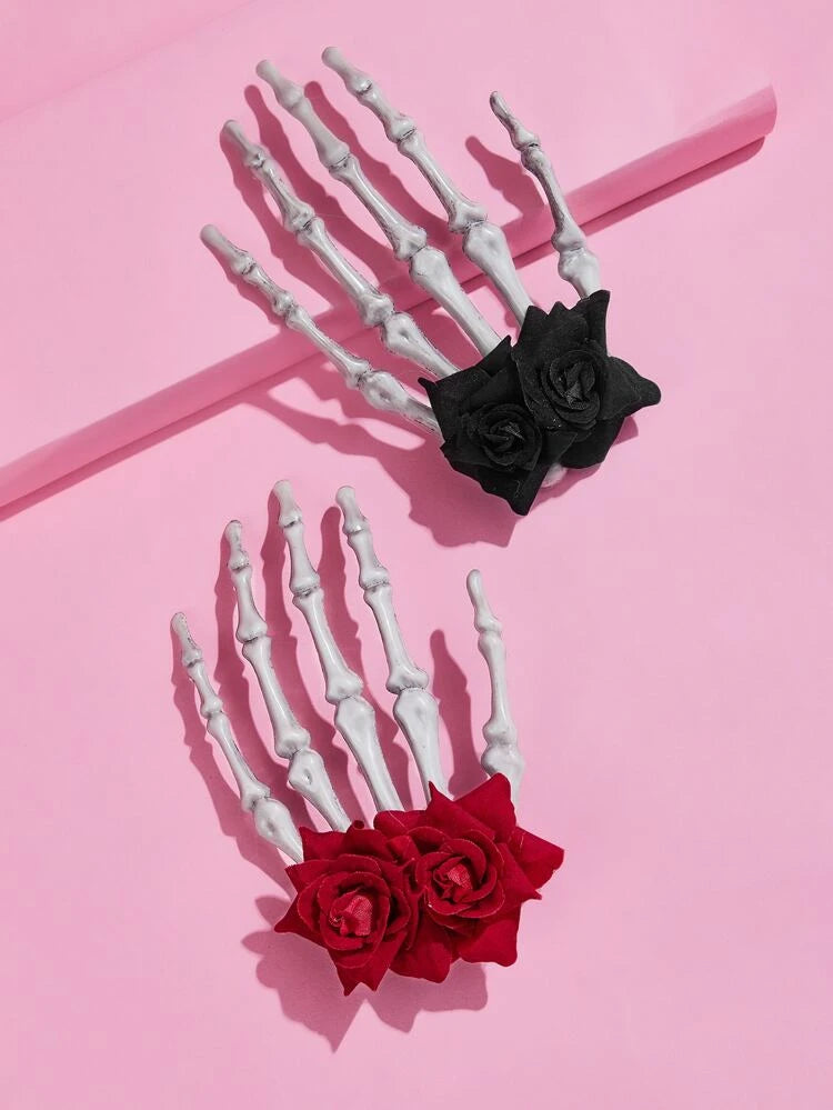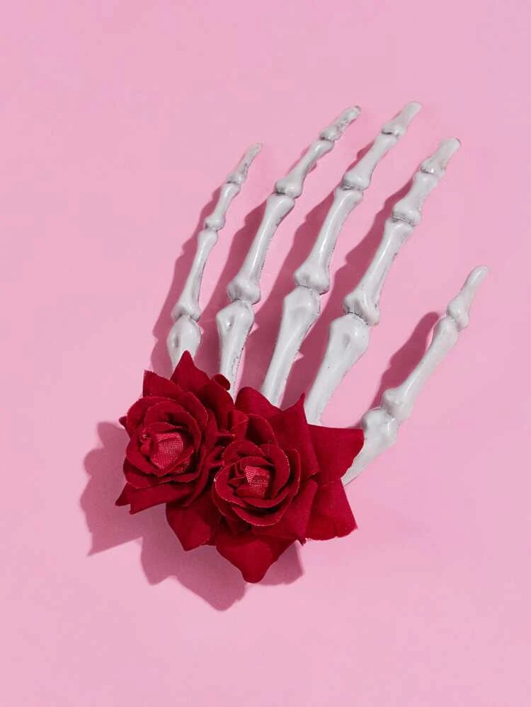 Pinza para el pelo con mano de esqueleto y rosa